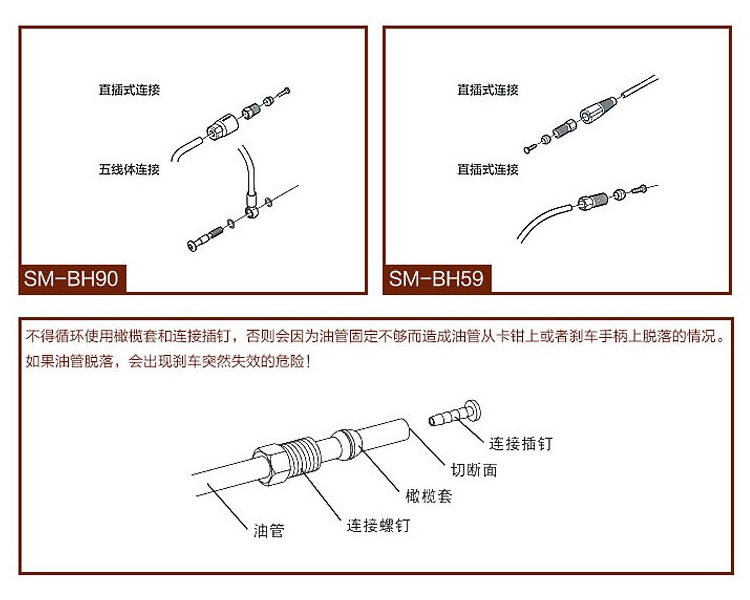 說明:欖頭是靠變形包在油管上起到固定與密封作用的,使用后的橄欖頭會變形且不可拆卸,所以鎖橄欖頭是一次性的。shimano剎車油管分為BH90/BH59,不同油管需要使用對應(yīng)橄欖頭跟油針。