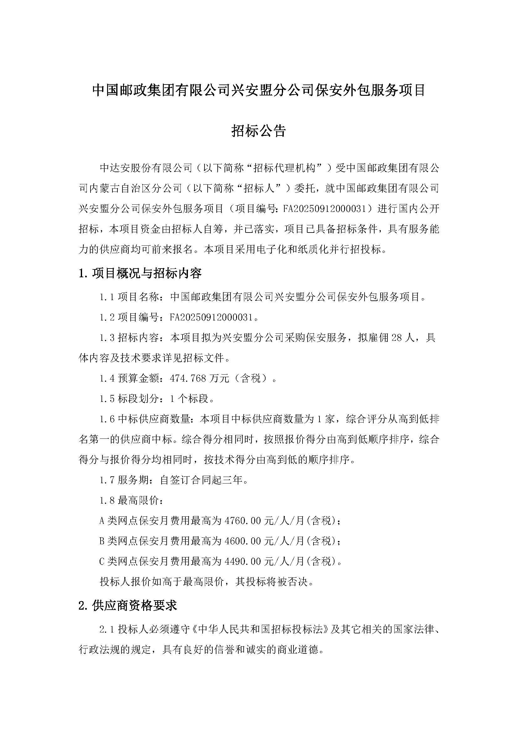 中國郵政集團(tuán)有限公司興安盟分公司保安外包服務(wù)項(xiàng)目招標(biāo)公告